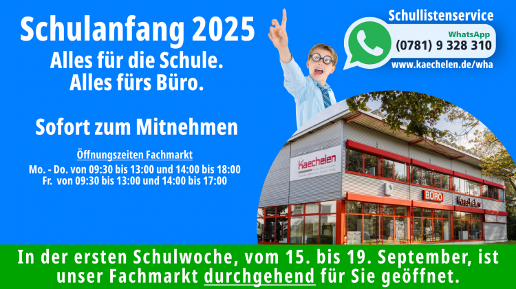 In der ersten Schulwoche vom 15. bis 19. September ist unser Fachmarkt durchgehend für Sie geöffnet.