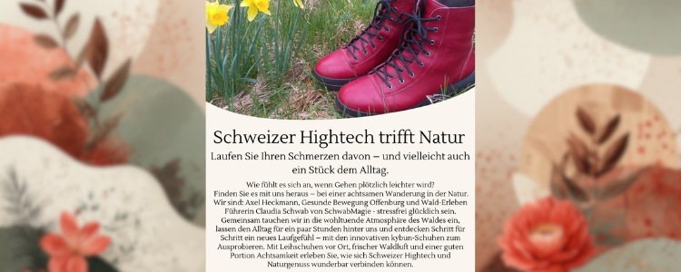 Im Mittelpunkt dieses Nachmittags steht die Verbindung von „Schweizer Hightech trifft Natur". Teilnehmer erhalten die Gelegenheit, die speziellen kybun Schuhe zu testen. Diese innovative Fussbekleidung ist bekannt für ihre weich-elastische Sohle, die das Gehen auf weichem Untergrund simuliert und damit eine gelenkschonende, muskelaktivierende Bewegung fördert. In der natürlichen Umgebung des Waldes können die Teilnehmer die wohltuende Wirkung der kybun Schuhe unter realen Bedingungen erfahren. Dieser Ansatz des „Swiss Natural Walking" integriert sich perfekt in das Konzept des Walderlebens, bei dem die Sinne für die Umgebung geschärft und die achtsame Wahrnehmung gefördert werden.