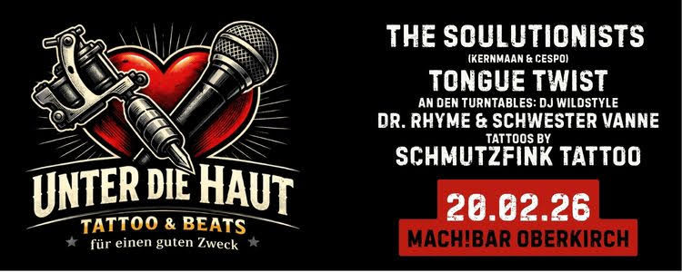 Ein Abend, der unter die Haut geht – im wahrsten Sinne des Wortes. Lasst euch von Schmutzfink Tattoo (Offenburg) ein kleines Kunstwerk stechen (Erlös wird gespendet) und feiert danach zu fetten Beats. Das musikalische Line-Up ist stark: Soul & Funk von The Soulutionists, HipHop von Tongue Twist, Doktor Rhyme& Schwester Vanne sowie DJ Wildstyle an den Turntables.