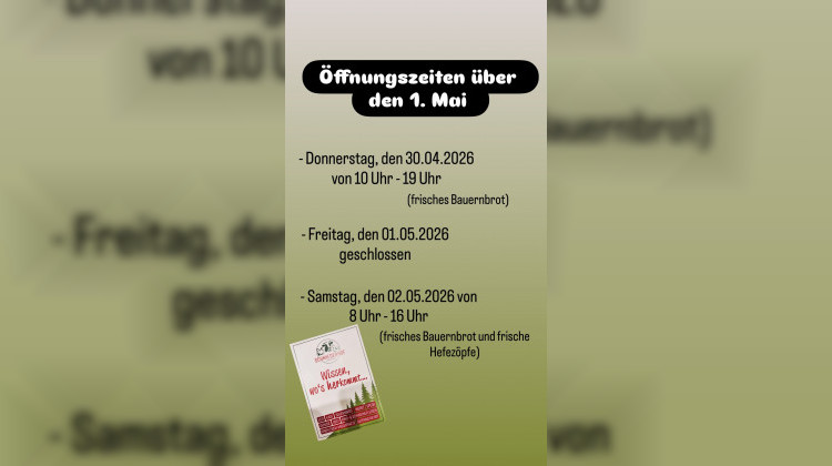 - Donnerstag, den 30.04.2026 von 10 Uhr - 19 Uhr (frisches Bauernbrot)